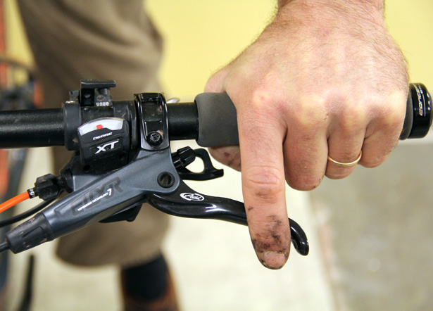 Much of a Pro mountain biker’s control, skill and speed lies in the way they use their brakes and the way they set-up their brake controls on the bars. Modern mountain bikes with hydraulic disc brakes, have brake levers that are specially designed to be used by one finger only in all situations. Moving your brake levers inward so that you’re only using your pointer fingers will give you better bike control, better feel for what the brakes and tires are doing and greater confidence in all of your riding.