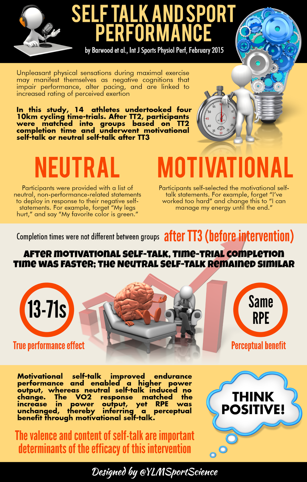 Rate of perceived exertion (RPE, how hard you think you’re working) is important in endurance sports. Reducing it through positive self-talk is a great way to improve performance. Swapping in a few phrases such as “I’m killing it today” “I feel powerful” and “My legs feel great” at key moments can be an easy way to add a more miles or and/or more watts.