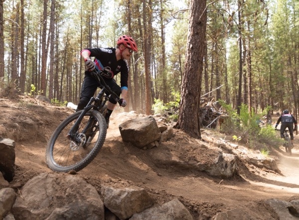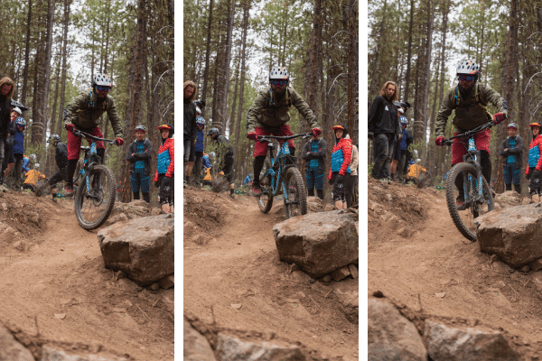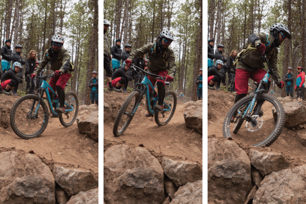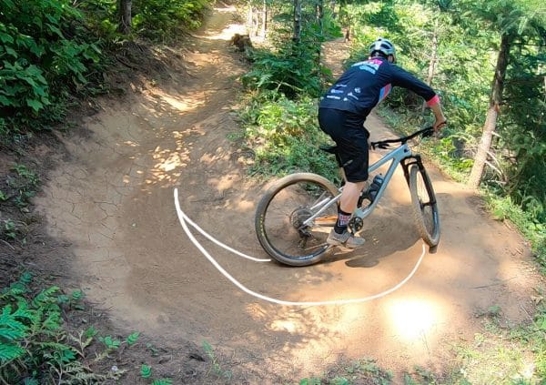 If you approach the corner from inside line (left side of the trail), it will be considerably tighter and sharper and you’ll be unable to carry momentum through it. Plus, your rear wheel always tracks even further inside than your front wheel where it can slip (as shown in the video) or get hung up on an obstacle like a rock or root.