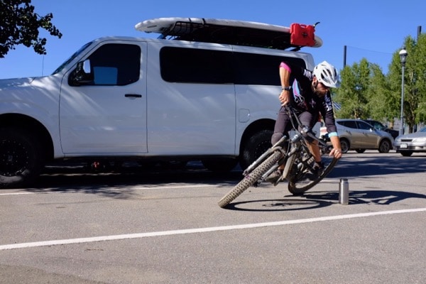 Time to bust out some props! Use objects to build a course and then ride around, over and through it. Get creative and make it a game of using all of your Ninja skills: bike/ body separation, ratcheting, braking, etc. If you’re in a parking lot, use the points of the parking spaces (the empty ones, doh!) as a slalom course and dial your cornering.