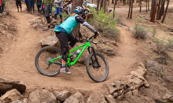 If you have a dropper post, drop it! Get your center of gravity low by bending your knees and elbows and lowering your body towards the bike. For tight and steep switchbacks push your hips back and swing them out slightly towards the outside of the corner. This hip rotation will help to bring your body and the bike around the apex with you.
