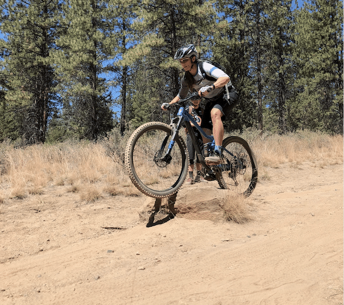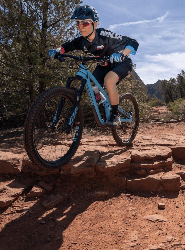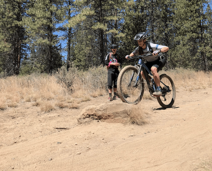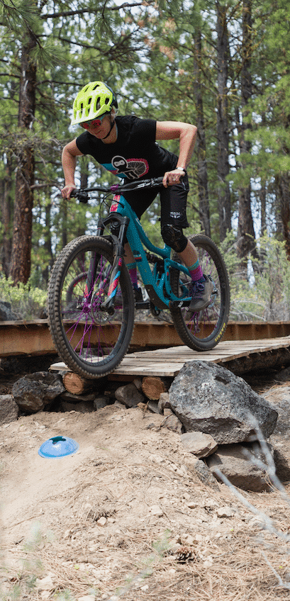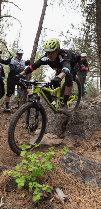 As your rear wheel transitions down the backside of the obstacle, bring your weight forward in order to return even weight to both of your wheels. Keep your head up and looking ahead. This recovery step is SUPER important. If you stay in the “push” position (aft on the bike), your arms would be locked out, preventing you from properly absorbing even the smallest rocks or obstacles on the trail below the drop. You also run the risk of looping over backwards if you don’t quickly recover back to your ready position – yikes!