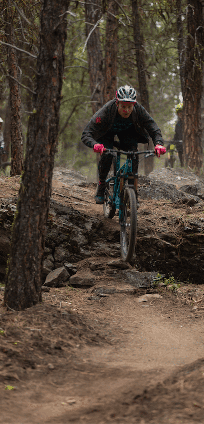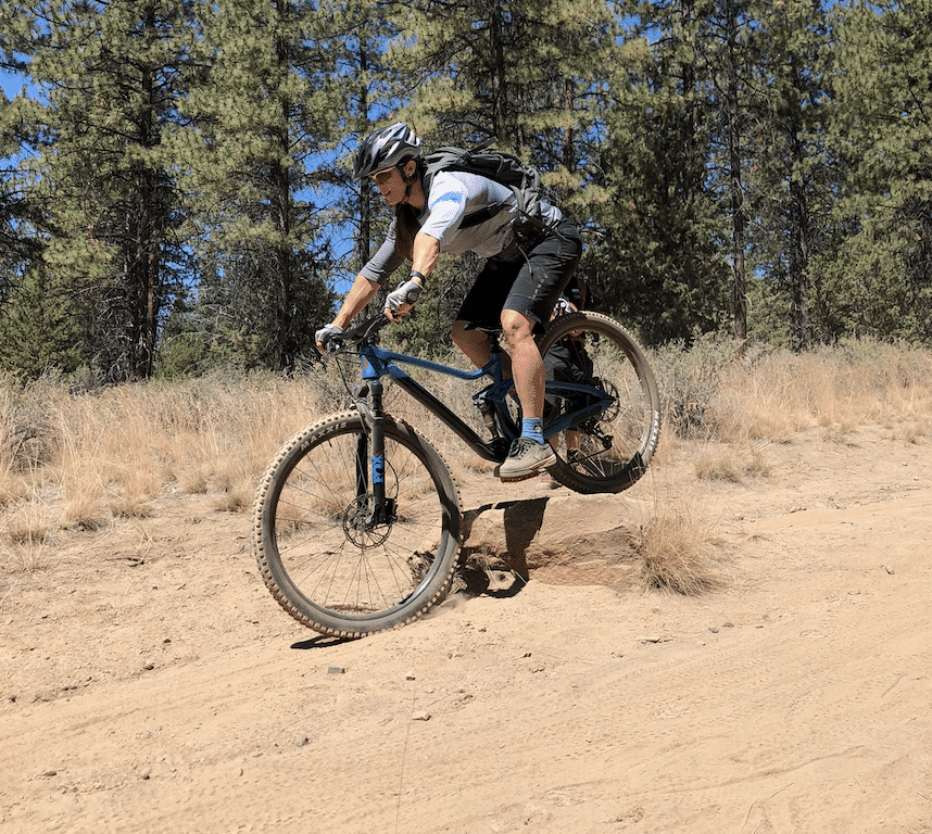 At the exact moment your front wheels start to roll over the transition, push your handlebars down AND forward. You should already be in a high ready position which gives you plenty of range of motion in your arms for this movement. This should be a quick and explosive movement that will push your front wheel forward and down the back side of the rocks while simultaneously allowing your weight to be back behind your saddle. Think of this as you telling your bike exactly where you want it to go – show that bike you mean business!