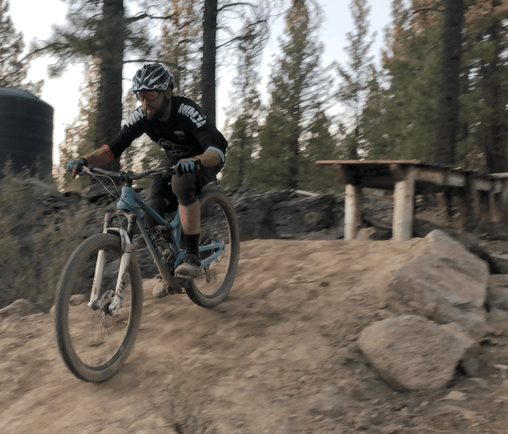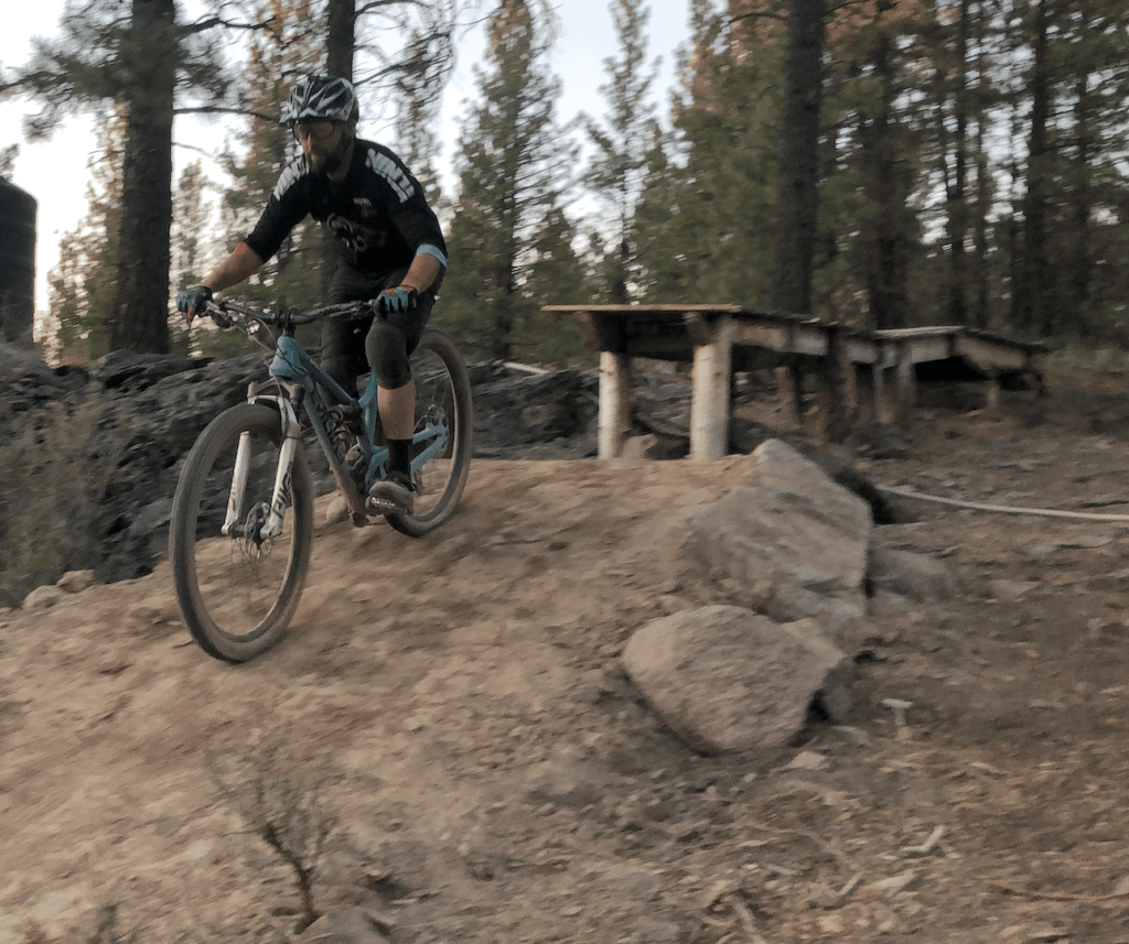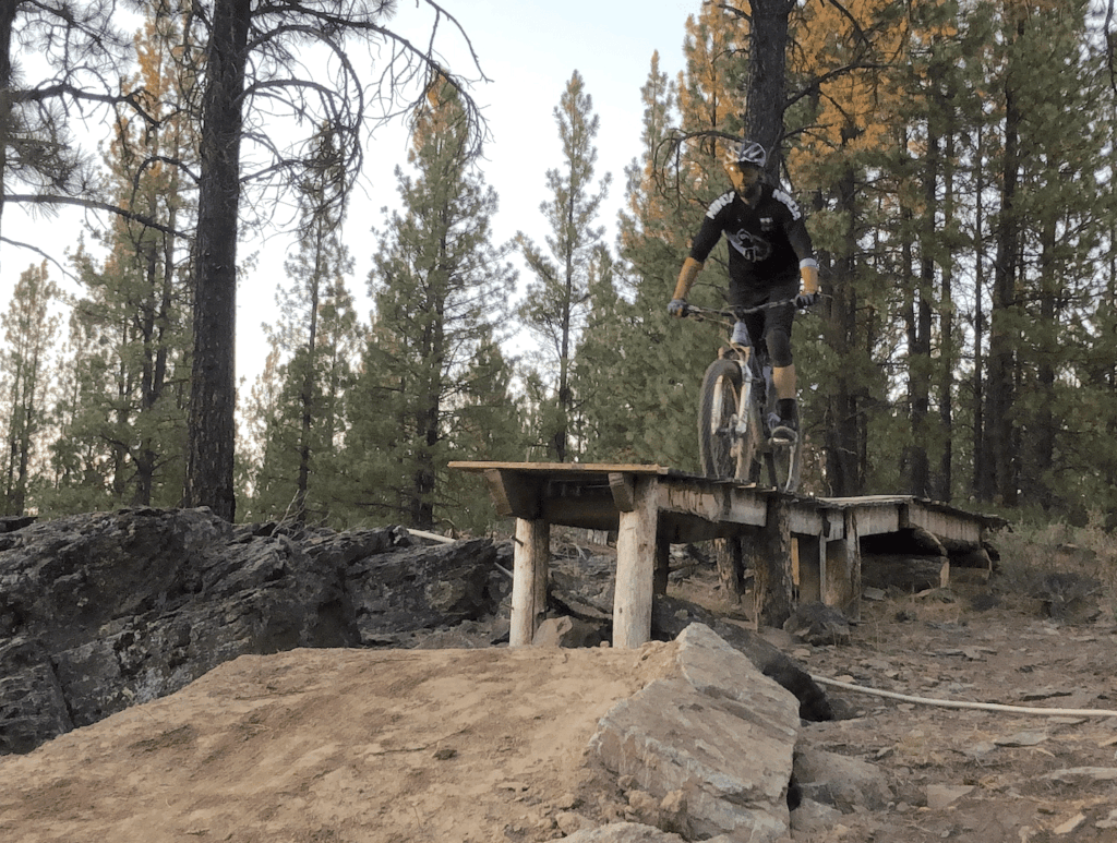 If you are new to riding drops, before you hit the trail, we recommend practicing the down-back “manual” motion in a flat open area. You should be able to get your front wheel to lift off the ground by hanging back for a second. Get your body used to this movement and then take it to the drops