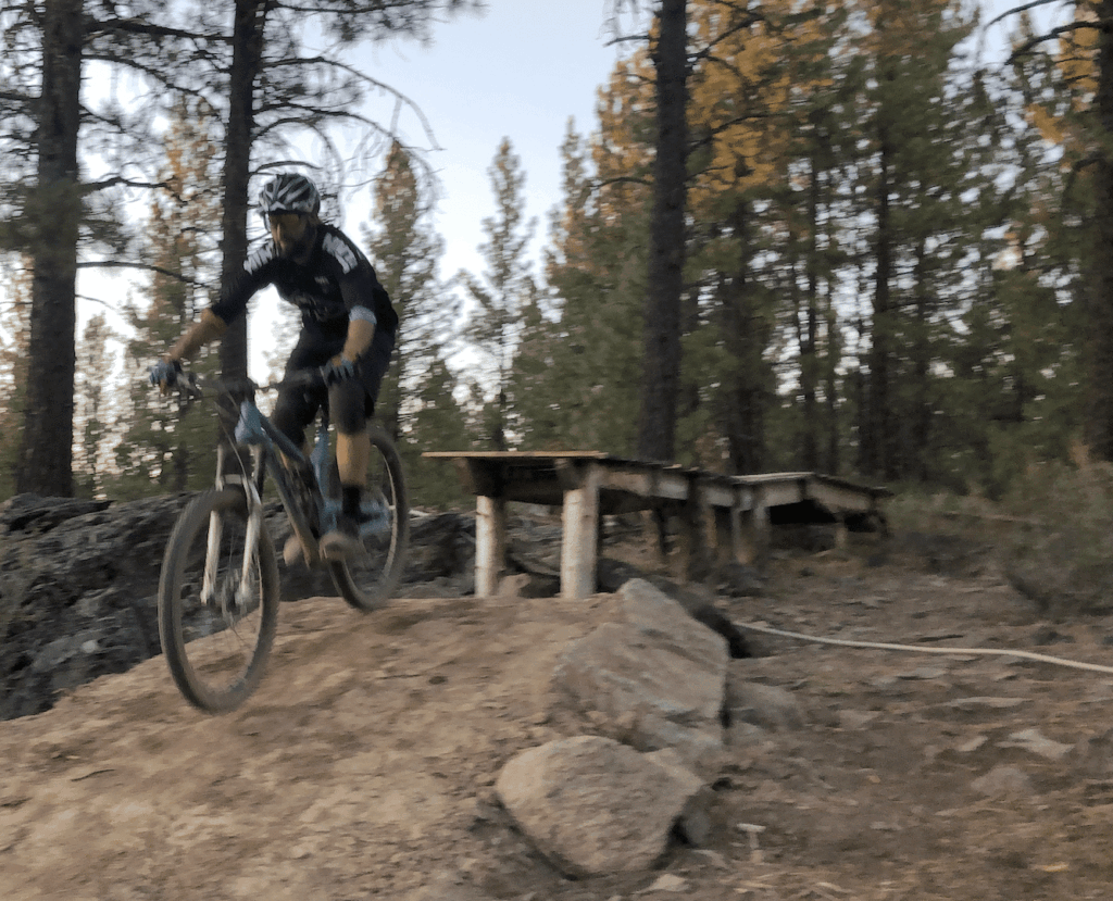 Another thing to consider- keep the landing quiet! If you’ve ever watched an advanced rider hit a big drop – they make it look so smooth and easy AND they land quietly. No big thud. No jerky motions. No whiplash.