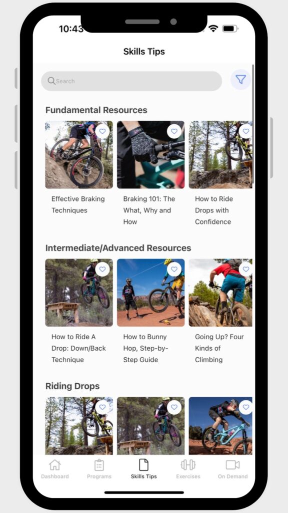 Skill Training Videos with Expert Guidance: Master your MTB skills through video lessons that guide you from foundational techniques to advanced moves, including high-speed cornering, technical climbs, descents, and overcoming tricky trail obstacles. Each video is designed to be clear and actionable, giving you the tools to practice effectively and improve quickly.