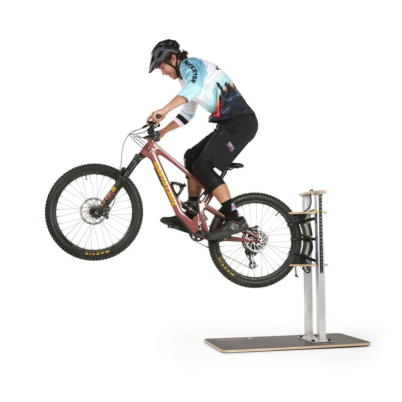 Garage Bunny hop trainer is my dream came true! As a busy mother of 4, I don’t have much time practicing the skills anytime I want. This is why the bunny hop trainer is my life saver! Easy to put on/off, any weather, any time it is here at my service. Safe and fun way to practice hops, bunny hops, manual movements, suspension settings, and simply to feel and get to know the bike better! 😁
