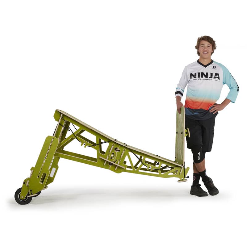 > The Ninja MTB Altitude ramp has a wheel extension that allows you to move a ready-to-use ramp from one location to another without un-assembling it.